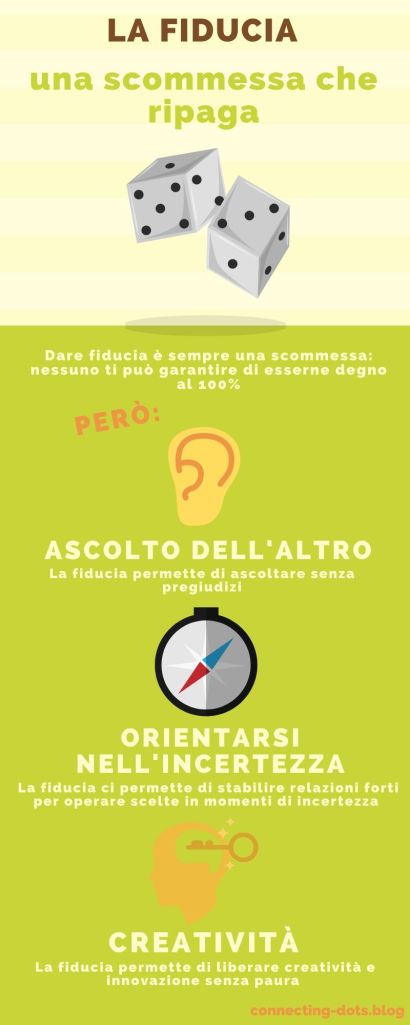 Terzo e ultimo stadio: la fiducia piena, quella che mi fa dire: va tu al mio posto, so che porterai i risultati che porterei io (o anche migliori); quella che contestualizza l’errore e non lo considera tale da mandare all’aria la relazione – seppure con dei limiti; quella che genera innovazione e creatività, perché non mi aspetto che l’altro segua le mie orme ma faccia un percorso che comunque non lo porterà mai a farmi del male.